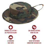 - Go ahead and wear your camouflage boonie hat without a worry! Constructed from a durable 55% cotton / 45% polyester blend, these camo hats easily withstand consistent outdoor use and sun exposure while providing a comfortable fit and feel.