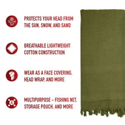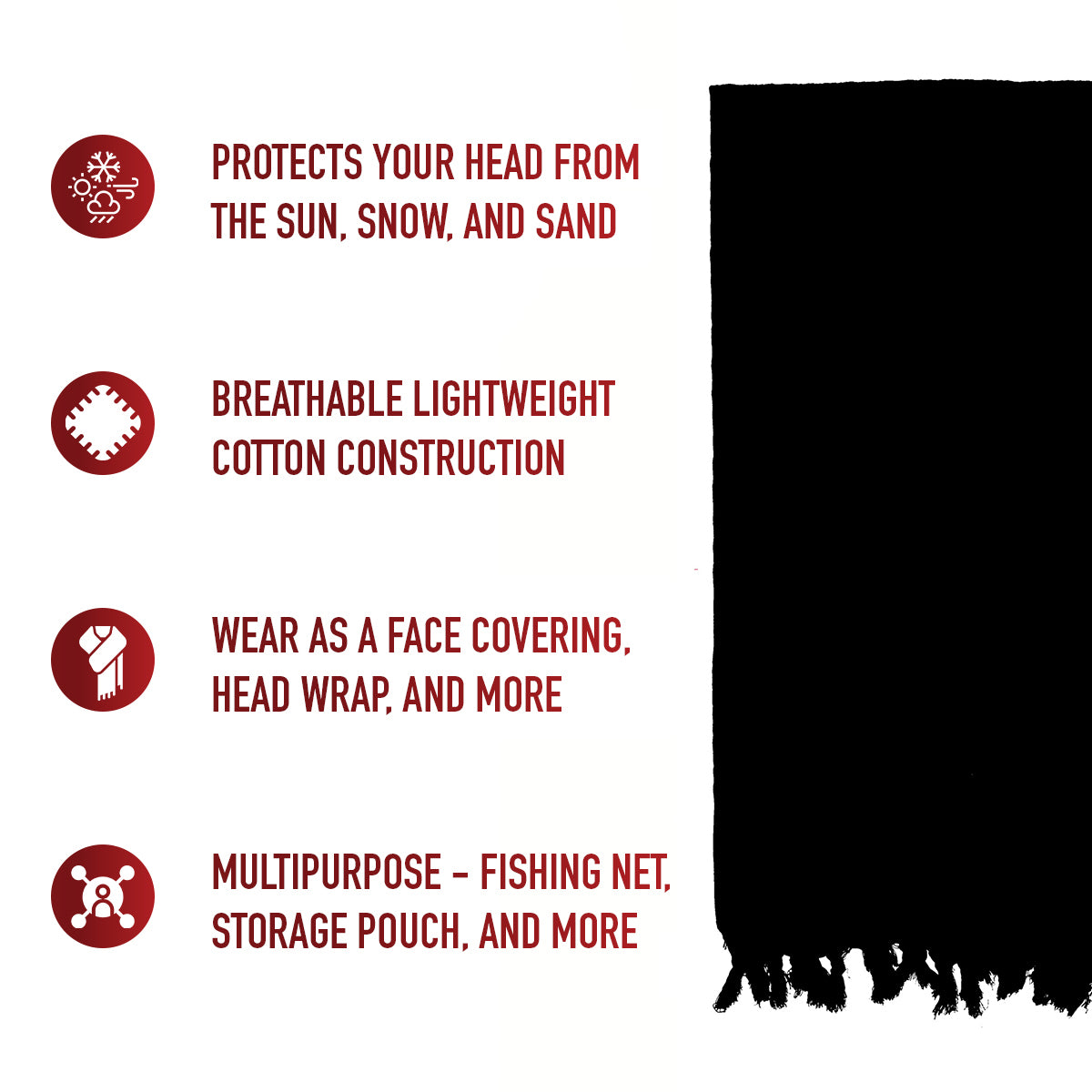- These tactical head scarf make for great survival tools that can be utilized as a makeshift sling, tourniquet, or pouch, along with being a ground cover, outdoor pillow, and much more. The possibilities are endless.