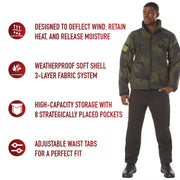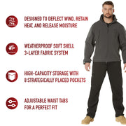 Defend yourself against the toughest weather with the Special Ops Soft Shell Jacket. As part of Rothco’s rugged Soft Shell outerwear series, the tactical military jacket features our Soft Shell waterproof 3-layer fabric system that deflects wind, retains heat, and releases moisture. The high-performance fabric helps protect and keep you comfortable while braving the elements. This versatile coat is great for military personnel, tactical professionals, and outdoor enthusiasts. Comfortable Fleece Lining: The insulated jacket features a soft fleece lining that keeps you warm, ideal for cold weather tactical operations and outdoor adventures. The fleece-lined collar features a removable stowaway hood and provides additional protection. High-Capacity Storage: The military soft shell jacket comes equipped with 8 tactical zipper pockets: 2 shoulder pockets, 2 chest pockets, 2 internal pockets, 1 back pocket, and 1 arm pocket for storing tactical gear and outdoor essentials. Utility at the Forefront: The tactical soft shell jacket features underarm ventilation zippers that ensure optimal comfort by allowing air circulation. The drawstring waist and adjustable elastic wrist cuffs provide a perfect fit, while the two-way zipper offers quick and easy access. In addition, the 2 shoulder loop fields allow you to easily wear patches. Action Ready: From the field to the forest, the military-styled soft shell coat offers exceptional utility and warmth that is great for tactical missions, camping, hiking, hunting, fishing, and casual everyday wear.