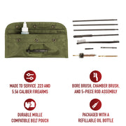 Ensure your rifle stays in prime condition with Rothco's Rifle Cleaning Kit. This compact kit is designed specifically for .223 and 5.56 caliber firearms. It includes essential tools like a .233 caliber and 5.56mm bore brush, chamber brush, and a 5-piece rod assembly. Additionally, this kit comes with a refillable oil bottle, allowing you to use your preferred gun oil (oil not included). The durable polyester MOLLE-compatible belt pouch ensures convenient storage and easy carry wherever you go. Keep your firearm clean and well-maintained with Rothco's reliable cleaning kit.