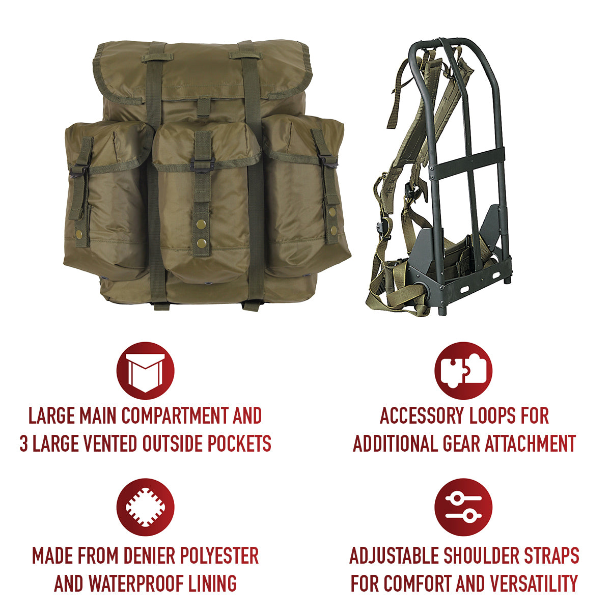 Rothco’s Medium Alice Pack offers a versatile solution for carrying your outdoor, tactical, or everyday essentials. Crafted with classic style in mind, this pack is constructed from durable denier polyester, ensuring long-lasting performance in various environments. With dimensions measuring 20 inches x 19 inches x 11 inches, it provides high-capacity space to store all your gear. The large main compartment is perfect for storing essential items, while the 3 large vented outside pockets offer additional storage for extra gear or quick-access items. Whether you're hiking, camping, or traveling, this pack keeps your belongings organized and easily accessible. For added comfort and versatility, the adjustable shoulder straps ensure a personalized fit, allowing you to carry your pack comfortably for extended periods. The waterproof lining provides protection against the elements, keeping your gear dry in adverse weather conditions. Equipped with accessory loops, this pack allows you to attach additional gear or accessories for easy access on the go. Plus, the heavy-duty aluminum frame is built to fit all G.I. LC-1 packs, providing structural support and stability during use. For enhanced comfort during extended wear, the polyester padded kidney pad and shoulder straps on the frame provide cushioning and support where you need it most. Whether you're on a hiking trail or navigating through urban environments, the Rothco Medium Alice Pack offers durability, functionality, and versatility to meet your needs.