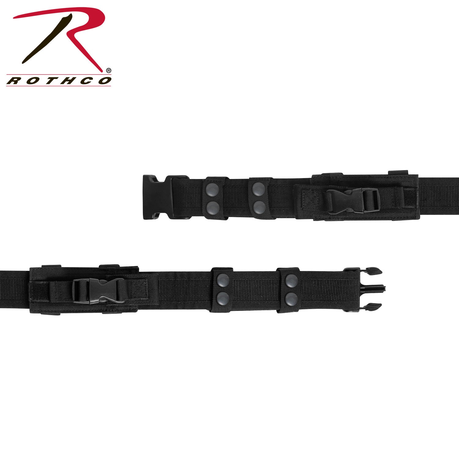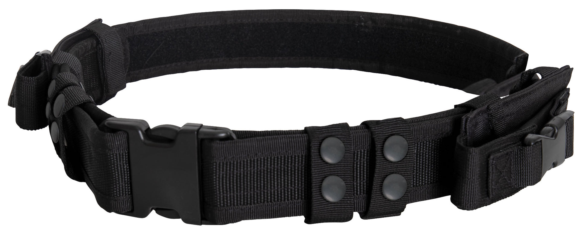 Rothco’s Tactical Duty Belt is constructed of a heavy-duty material to ensure stability and reliability while holding the weight of your professional gear. The police belt is also fully adjustable comfortable fitting most waist sizes. Hold public safety items such as your firearm, handcuffs, and other uniform gear. The belt is equipped with two removable pouches with hook & loop closures that are ideal for storing folding knives or other small security items. The 2" wide quick release buckle allows for easy removal. Tactical belt fits a 48" waist at the largest and 29.5" at the smallest. Tactical belt is ideally worn by police, military, public safety, and law enforcement personnel.