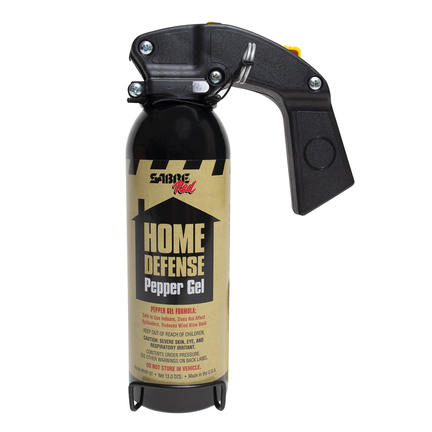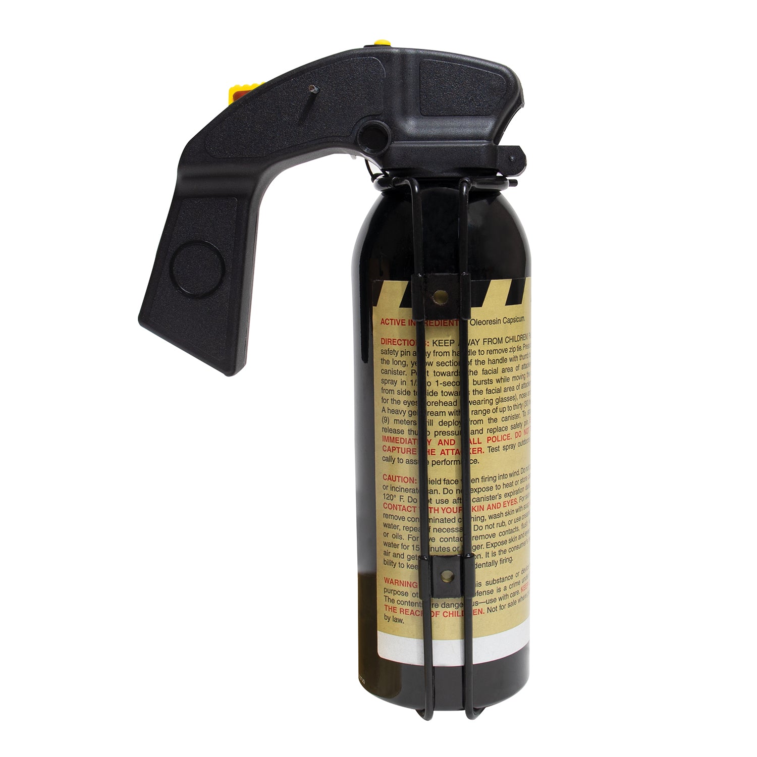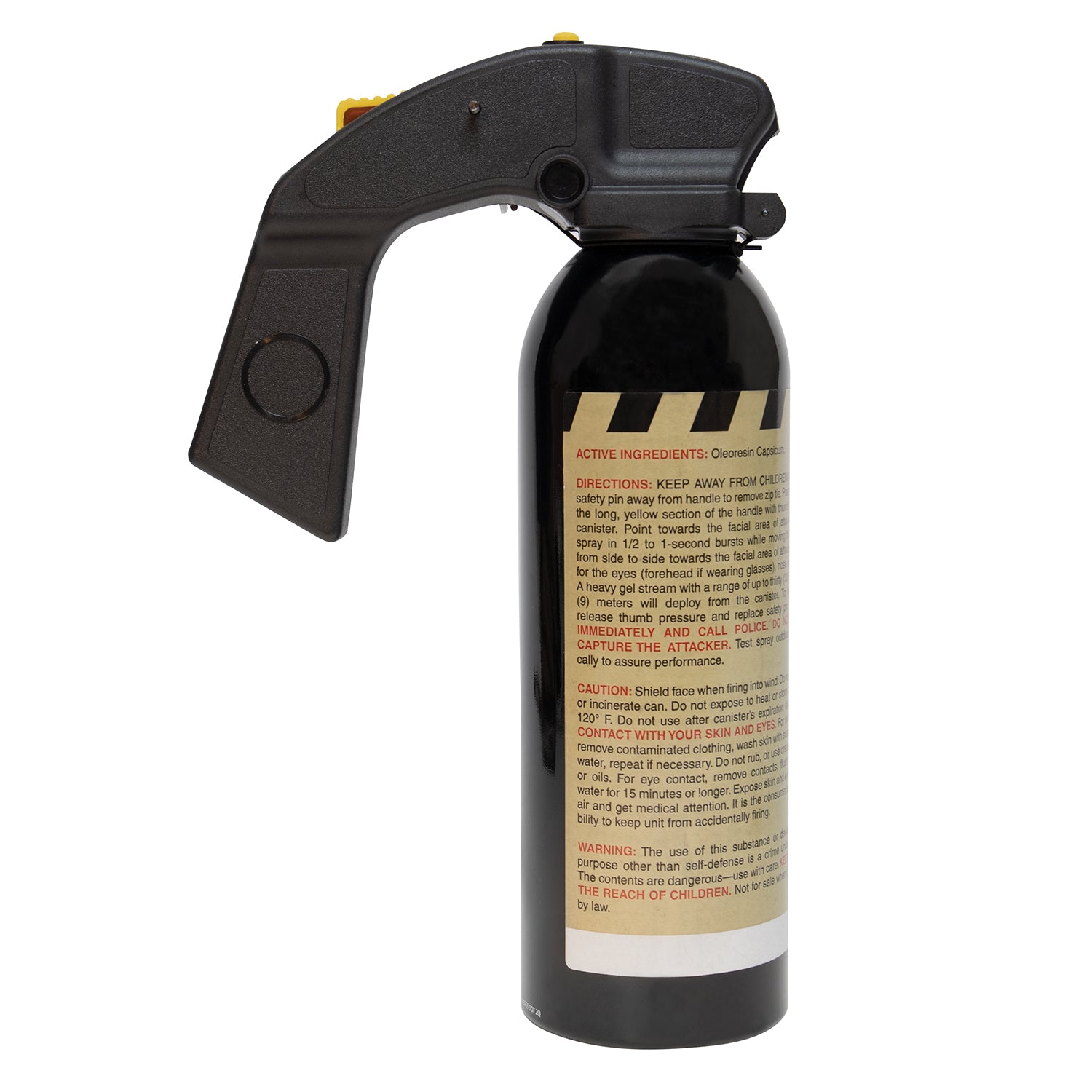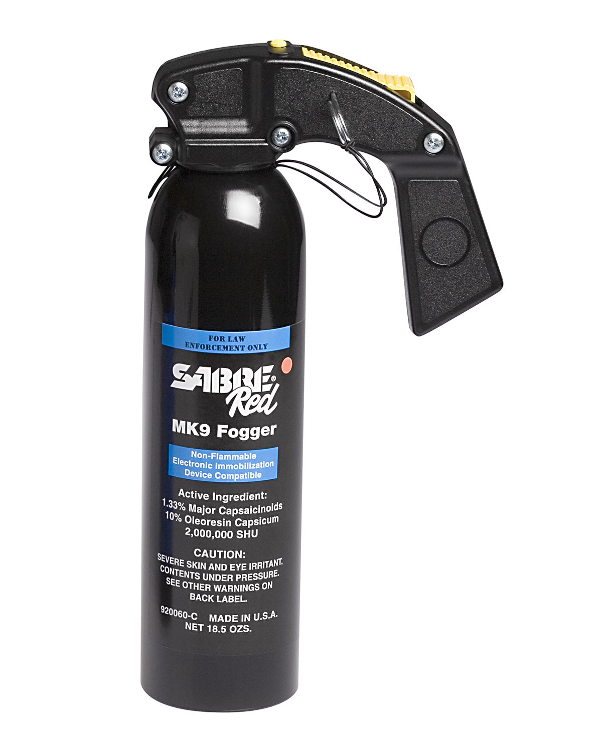 SABRE RED 1.33% MC, 18.5-ounce MK-9 Fogger deploys twelve full one-second bursts at a range of 25 to 30 feet. The MK-9 utilizes a pistol-grip handle with a safety tab and pin to prevent accidental discharge. All SABRE MK-9 pins are equipped with a safety lanyard for easy portability and quick access.