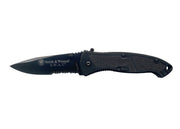 The Smith & Wesson Medium SWAT Assisted Opening Knife has 3 1/4" 4034 Stainless Steel Combo Edge blade. It has a black aluminum handle with inserts and a spear point to go along with the serrated blade. The Smith & Wesson Medium SWAT Assisted Opening Knife also comes with a pocket clip for easy transport.