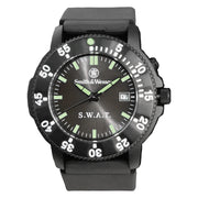 The Smith & Wesson S.W.A.T. Watch is bold in style and features a round black face with Smith & Wesson logo and a stylish smooth rubber wristband. This watch features precision quartz Japanese movement and includes a glow in the dark back with hands to show the hours, minutes and seconds, date display, tough stainless steel case for impact resistance and reliability, and a scratch resistant hardened mineral glass crystal that protects the dial. The watch is also water resistant up to 30 meters.