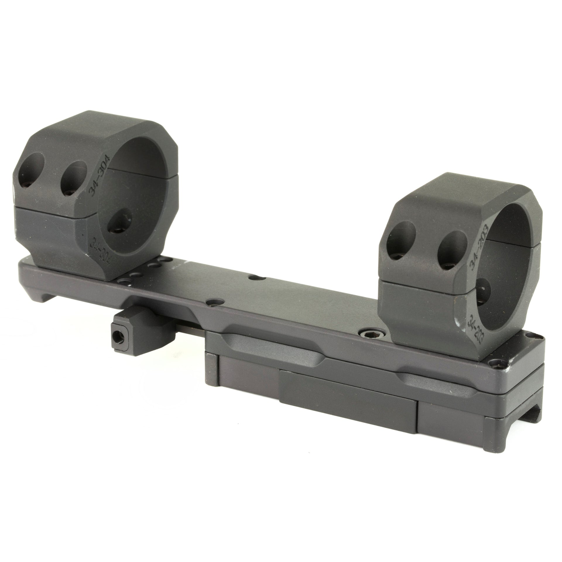 The new KDG Modular Optic Mount is based off the proven Sidelok family of quick detach optic mounts, and features the same user-friendly, tool less design. KDG set out to design a Sidelok mount for all common, tube-style optics that will offer more user-configurable options than what is currently available from competing QD mounts. The mount is offered with a user removable cantilever bar, in which the rings securely mount. This bar runs parallel to the weapons bore, and is ideal for all semi and fully automatic carbines, rifles and DM style firearms. The matched front and rear rings are CNC machined, and wire EDM cut to be as precisely concentric as possible. The upper and lower ring remain matched for the duration of its production, and feature witness marks for assembly in the form of recessed dots. This allows the user to match the proper ring to its base, and ensure the mount is as truly aligned as possible. The rings themselves can be adjusted forward or back to the users preference, to avoid interference with large front objective bells, turret adjustment knobs, and rear magnification adjustment collars. The rings themselves bolt into a track system to facilitate this adjustment. The same track system allows the user to purchase and install separate rings in the future, should they decide to change to an optic with a larger or smaller diameter tube. This feature will save the shooter or organization money, as the majority of cost is in the base of the unit.