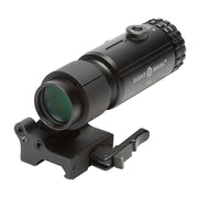 Built for shooting versatility, the Sightmark T-5 is a magnifier that mounts behind a reflex sight or red dot and provides an absolute co-witness. Instantly change the magnification of your close range optic from 1x to 5x by using the T-5s flip to side mount. The magnifiers streamlined, low drag design prevents it from snagging on clothing and equipment and makes the T-5 .7" shorter than the magnifier its replacing. Ideal for stretching your AR engagements out to 200 yards, an included LQD mount allows for rapid attaching/detaching in intense shooting situations. The T-5s aluminum construction is shockproof up to .308 caliber rifles and provides IP55 water resistant protection. Brightness and resolution are improved from fully multi-coated optics and external windage and elevation adjustments help shooters align the reticle of their red dot/reflex sight to the center of the magnifiers point of view. The Sightmark T-5 includes flip-to-side LQD mount, adjustment tools and manual.