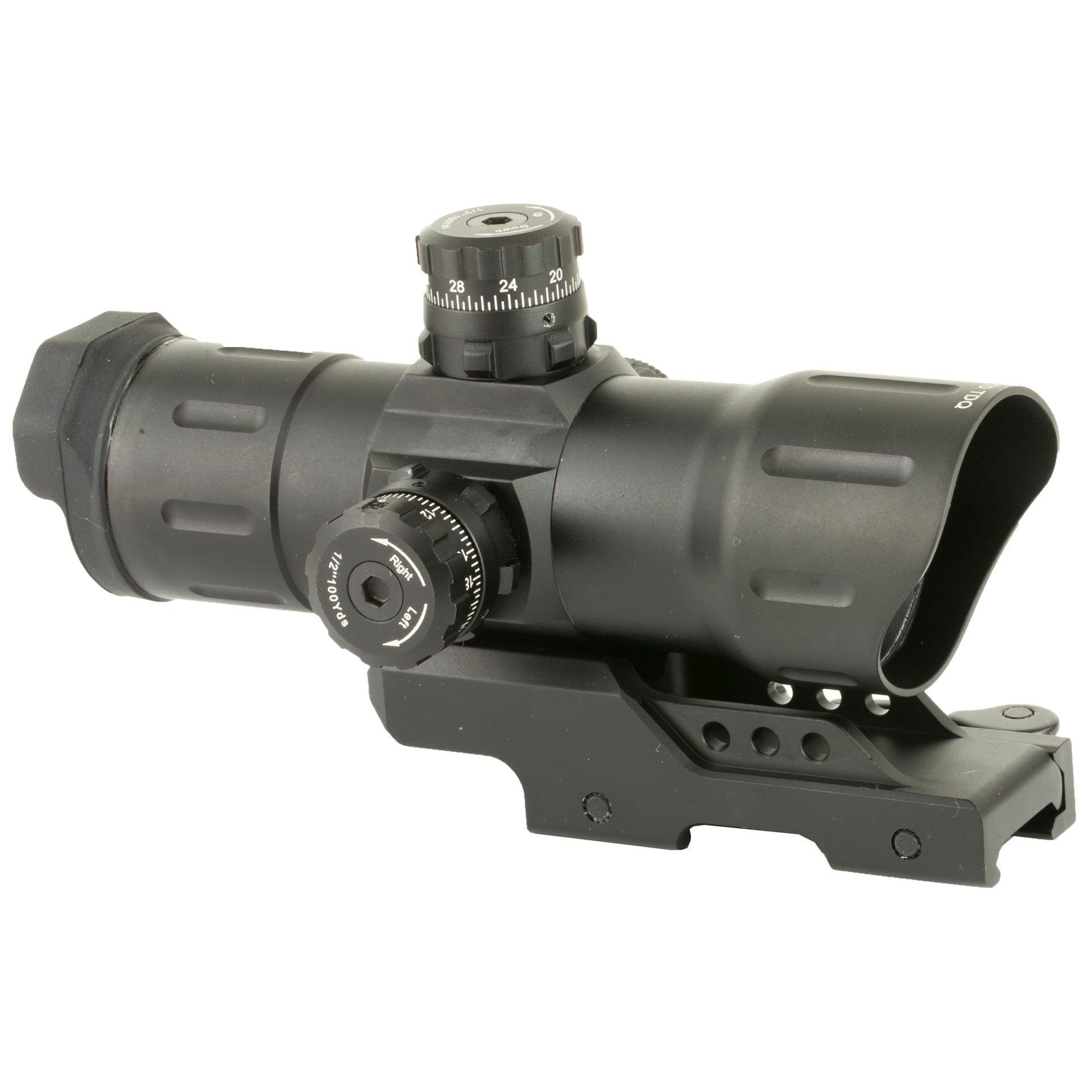 Built on True Strength Platform to Offer Durability and Precision Adjustment; Completely Sealed, Shockproof, Fogproof and Rainproof. Unlimited Eye Relief and Intuitive, Quick-to-Acquire Red/Green T-dot Reticle for Swift Execution of T-Zone and Center Mass Hits. Premium Zero Lockable and Zero Resettable Target Turrets with Most Consistent, Precise and Reliable 1/2 MOA per Click Adjustment and Zero Hold Capability. 42mm Center Height for 1/3 Co-witness of Front and Rear Iron Sights. TactEdge Angled Integral Sunshade Reduces Glare Off the Lens While Maintaining Superb Light Transmission Clarity. Complete with Lens Covers and QD Dual Lever Lock Bidirectional Offset Mount that Frees Up Flat Top Real Estate for Magnifiers, Rear Sights and Other Accessories