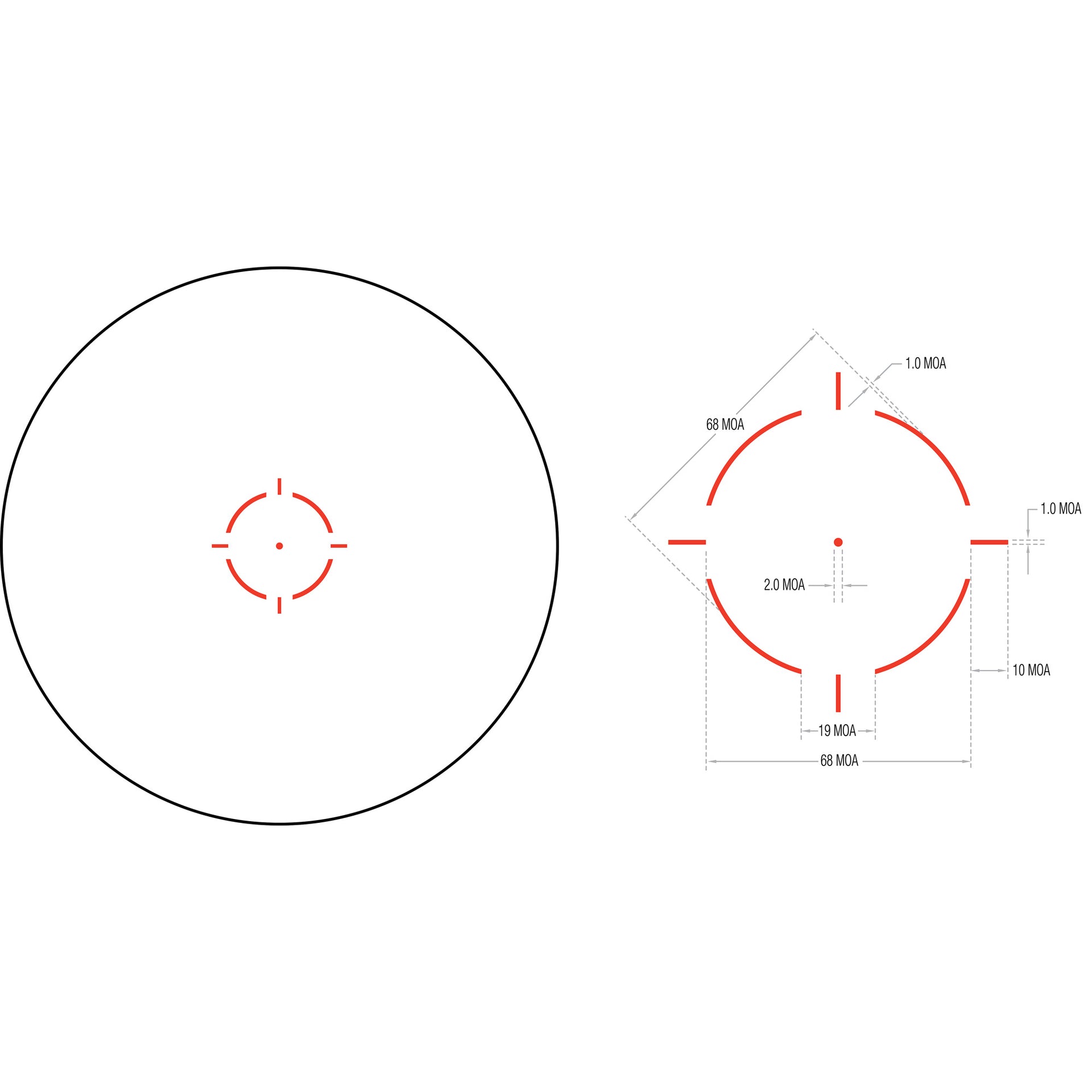 The Trijicon Miniature Rifle Optic (MRO) is a reflex-style, sealed sight intended for use on rifles, carbines, and shotguns to provide fast target acquisition. It is designed to be used with both eyes open, providing the operator with maximum situational awareness. The large aperture and tapered light path maximizes the viewing area in such a small optic, allowing for fast target engagement - especially from non-standard shooting positions. It also features ambidextrous brightness controls, sub-flush adjusters, advanced lens coatings, and a fully sealed, waterproof, hard anodized forged 7075-T6 housing, making the MRO the ultimate mini reflex sight. The MRO HD is optimized for use with a magnifier, with a re-engineered objective lens to produce a refined 2.0 MOA center dot surrounded by a 68 MOA segmented circle reticle. The ambidextrous reticle and brightness control allows the user to choose between a full reticle or center dot only.