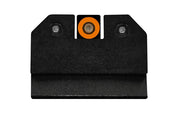 XS R3D Night Sights feature a traditional 3-dot tritium, notch and post sight picture. The blacked out rear increases contrast against the front sight. Available in orange or green, the front sight ring is equipped with their Ember Glow Dot Technology which absorbs ambient light and glows in low light. R3D sights are the brightest options for fast and accurate shooting in bright and low light. Green is the best option for low light and has the brightest glow intensity. Orange contrasts the best in bright light settings while still maintains visibility in low light. The front sight tritium lamp is brighter than the 2 rear sight lamps, reducing the possibility of mixing up the front sight tritium vial with a rear sight vial in low/no light. The front blade measures 0.145" (3.68 mm) wide, and the rear notch is 0.170" (4.32 mm) wide, which increases the visibility of the front sight. R3D sights are installable by sight pusher tools or by using a hammer and punch. Fits HK VP9 Optic Ready. Suppressor Height and lower third co-witnesses with Glock factory cut and RMR.