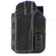 The Slim-Tuk Carbon Fiber is a minimal ambidextrous IWB holster fashioned from Kydex sheet. One of the most unique features about this IWB holster is that it uses DeSantis tuck-able 360 C-Clip, which affords the wearer unlimited mounting options. The hardware can easily be reversed to change from right to left hand. The Slim-Tuk is precision molded and has adjustable tension and a rugged 1.75" nylon clip. Carbon Fiber exterior finish with a Blue Kydex interior.