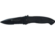 The Smith & Wesson SWAT Assisted Opening Knife has 3 3/4" Stainless Steel coated combo edge (40% Serrated) blade. The handle has black rubber inserts for extra grip and a pocket clip.